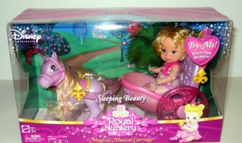 With her precious pony and royal carriage, this little Sleeping Beauty is the cutest baby princess in all the land! The Royal Nursery Princess dolls have baby ponies with glitter accents and manes and tails to comb. Each pony matches its princess and comes with a detachable carriage that will seat the princess baby and pull her along for a royal ride. A push button switch activates music. Includes baby Sleeping Beauty and matching pony and carriage.