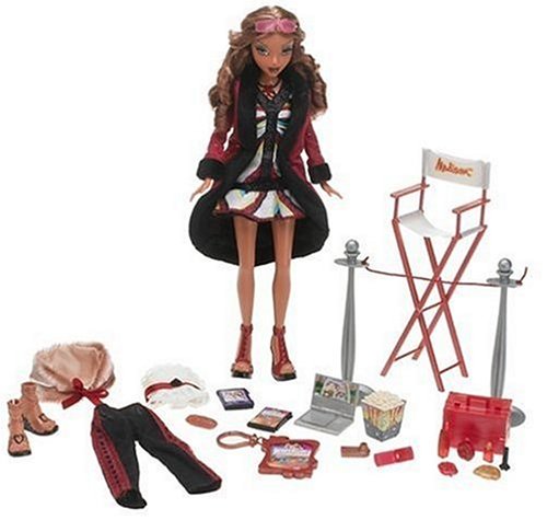 My Scene Goes to Hollywood, where the gang are all cast as extras in a glamorous Hollywood movie. Dressed for the red carpet, Madison wears a sparkly striped mini-dress with a red sequined fur-trimmed coat. Platform sandals, distinctive jewelry, and movie-star shades complete her look. Madison’s accessories include a director’s chair, a laptop, movie magazines, popcorn, and a wardrobe trunk filled with various cosmetics and jewelry. Madison also comes with a second outfit that lives up to her newfound celebrity status: black-and-red pinstriped pants with lace trim, a white lace bustier, a fur wrap, and an alternate pair of platform sandals. Although geared to kids as young as 6 years old, some parents may deem the clothing and makeup on these dolls to be a bit risqué for younger children.